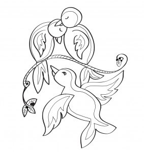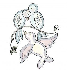 I first played around with several compositions, with the most obvious choice being three birds sitting on a branch. However, I thought that her intended meaning might come through better if the two birds representing the twins were on the branch sleeping and in a protective pose over the flying bird representing her daughter.
