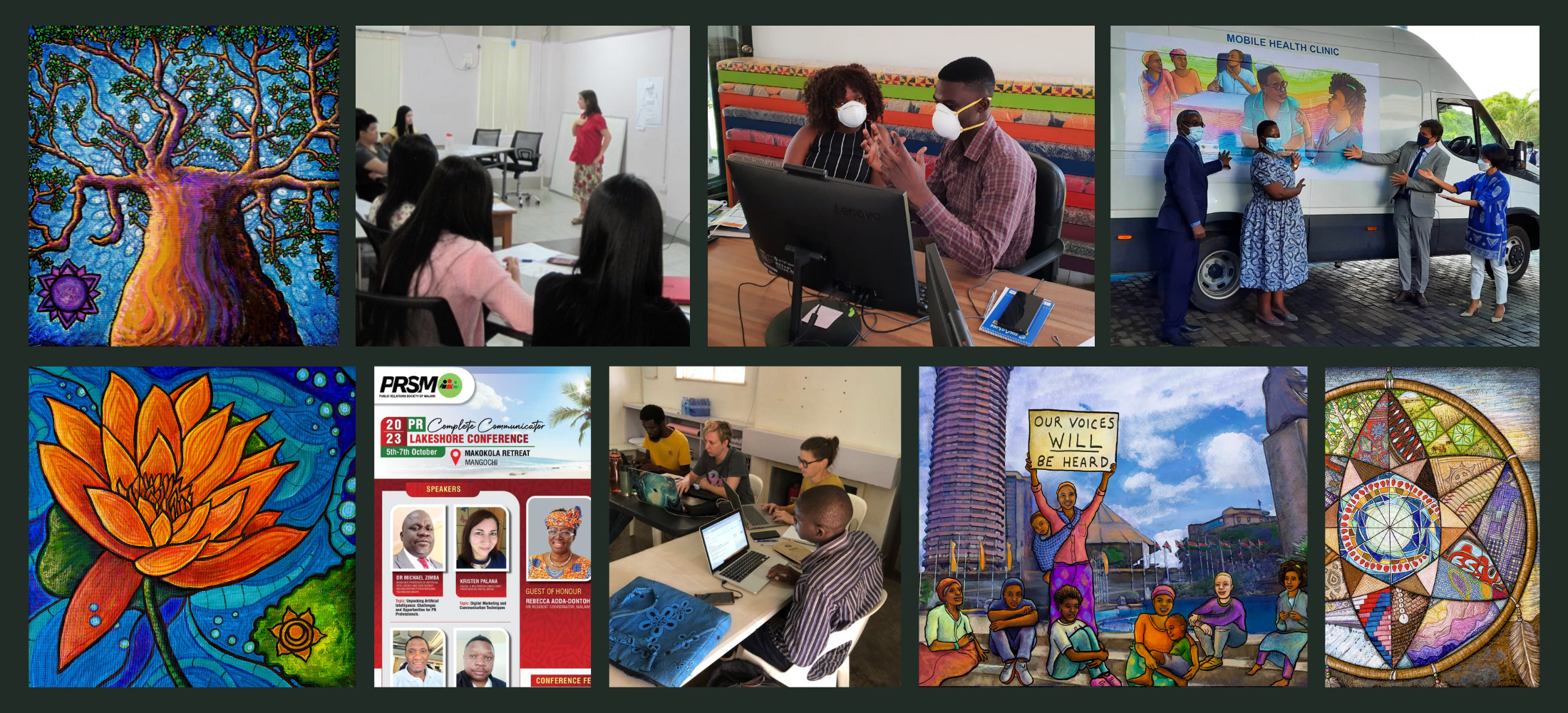 Clients include UNFPA (Malawi), The British High Commission (Malawi), The Australian High Commission (Malawi), Public Relations Society of Malawi, The World Food Programme (Myanmar), Mango Group (Myanmar), GIZ (Myanmar), and Addis Ababa University (Ethiopia).